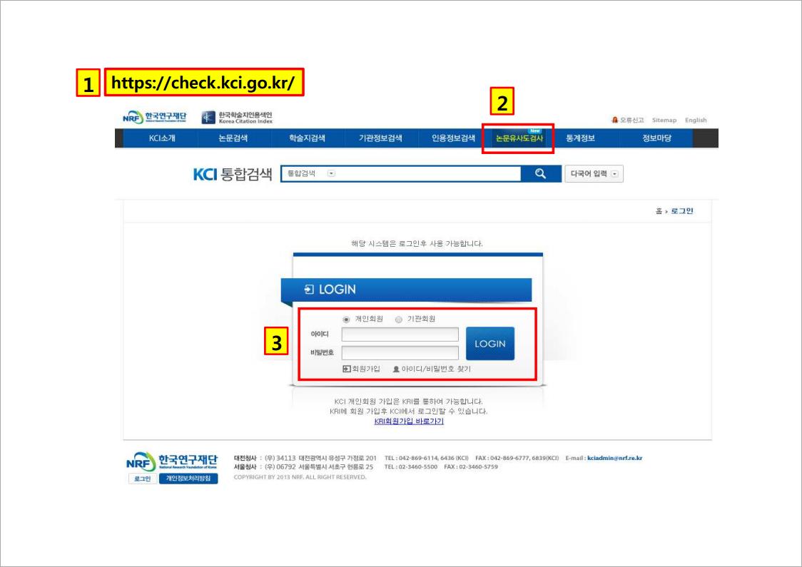 - KCI 문헌 유사도 검사는 KRI(한국연구자정보)에서 회원가입과 로그인을 한 뒤 가능합니다. KRI의 회원 ID로 ‘KCI 유사도 검사 시스템’에 로그인 할 수 있습니다.